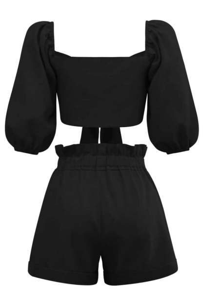 Linen Wrap Front Tie Puff Sleeve Shorts Sets