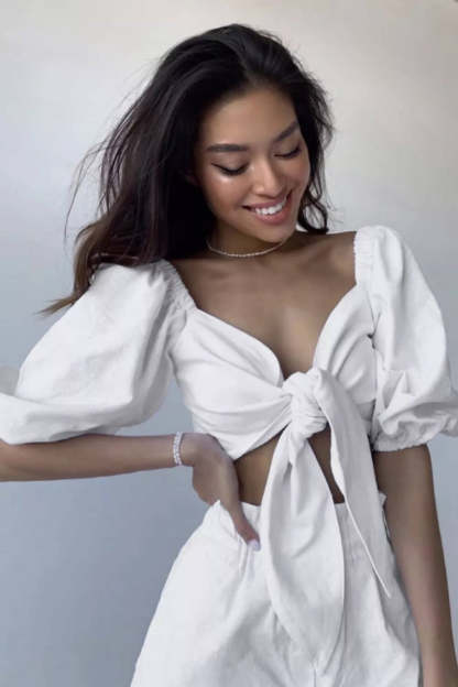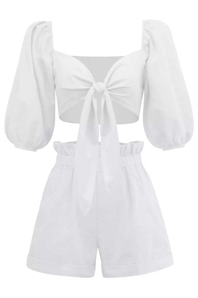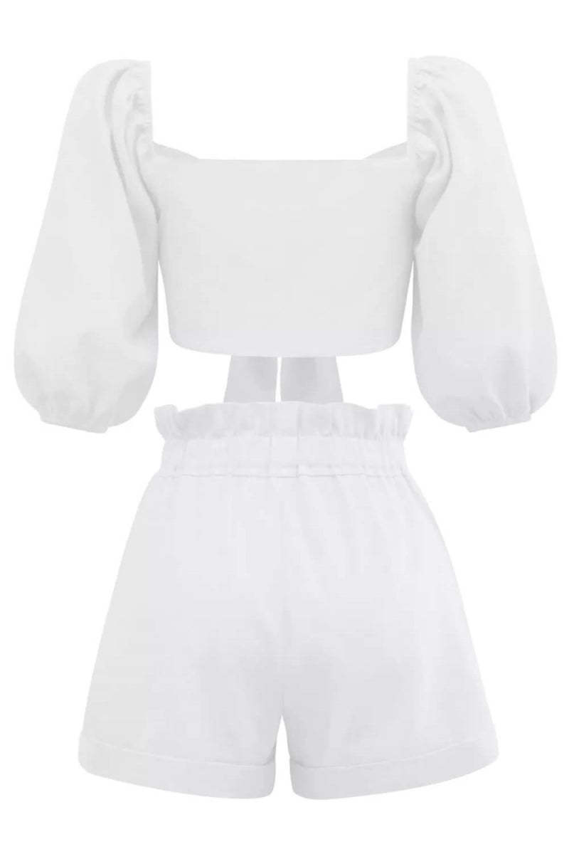 Linen Wrap Front Tie Puff Sleeve Shorts Sets In White